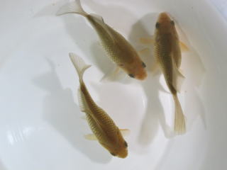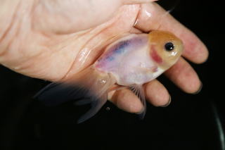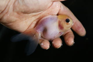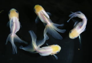 この品種はゴールデン系の金魚から突然変異で出現した個体を累代繁殖して固定化したものと思われる。