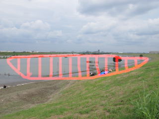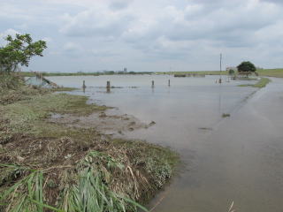 土手にはサッカー場や草野球場があるのですが、まだ水が残っていて川のようです。