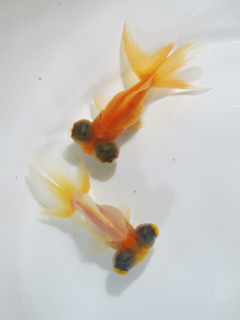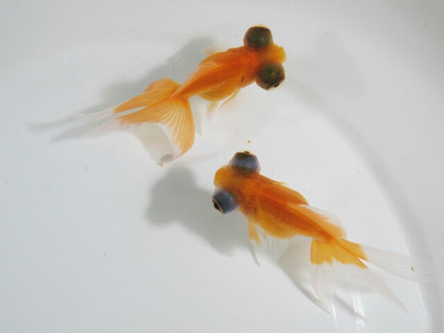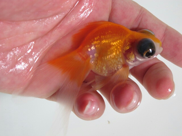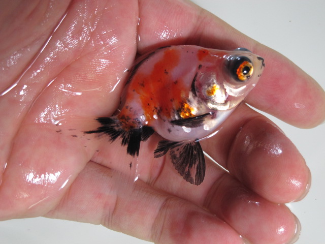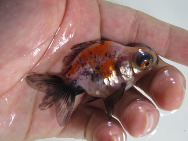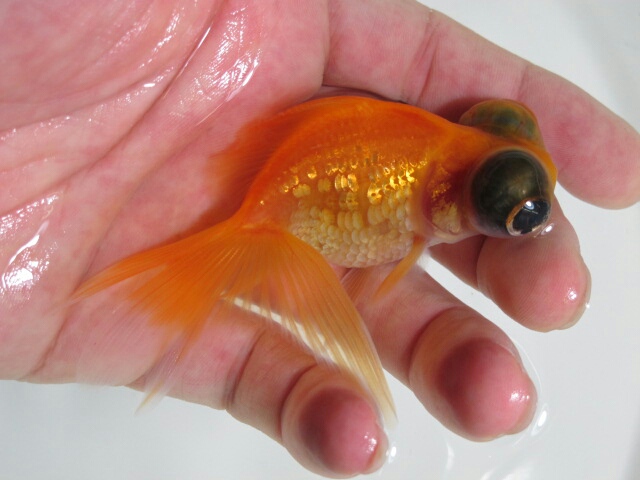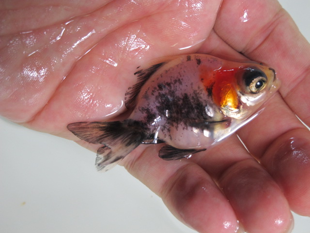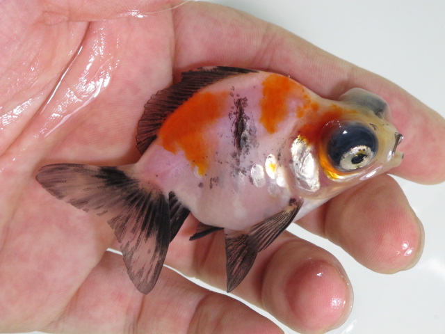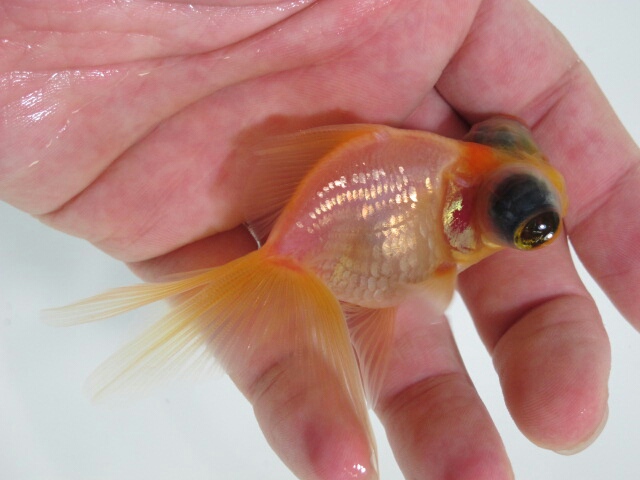 頂点眼の中に鱗乱れ個体、今で言う木村さんが作出してらっしゃるキラキラ金魚という品種のような鱗をもつ個体を見つけたり。