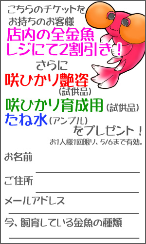 金魚生体をお買い上げ頂かなくても、チケットをご記入の上お持ち頂ければ、勿論プレゼントしちゃいますよ!