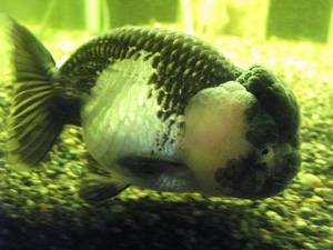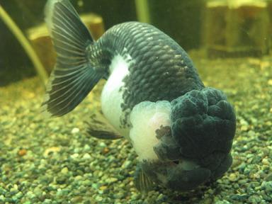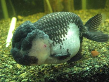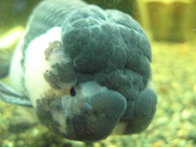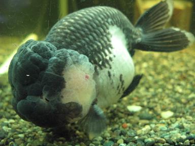 一匹でゆうゆうと泳ぐ、白黒色のらんちゅうが・・・