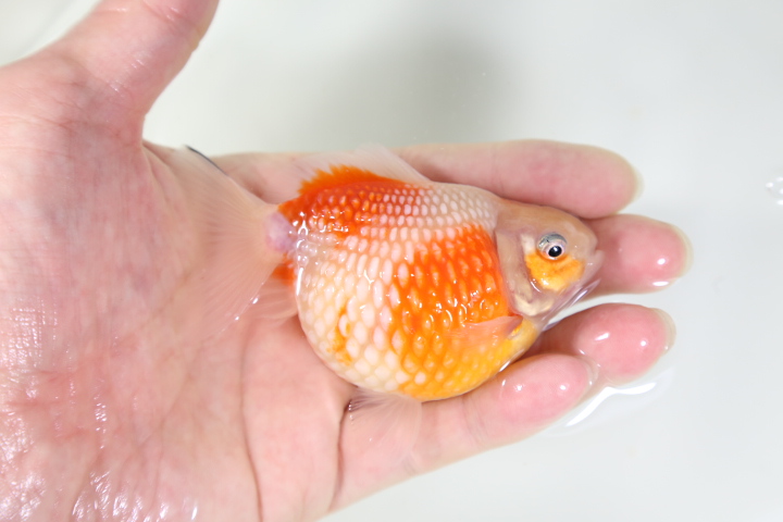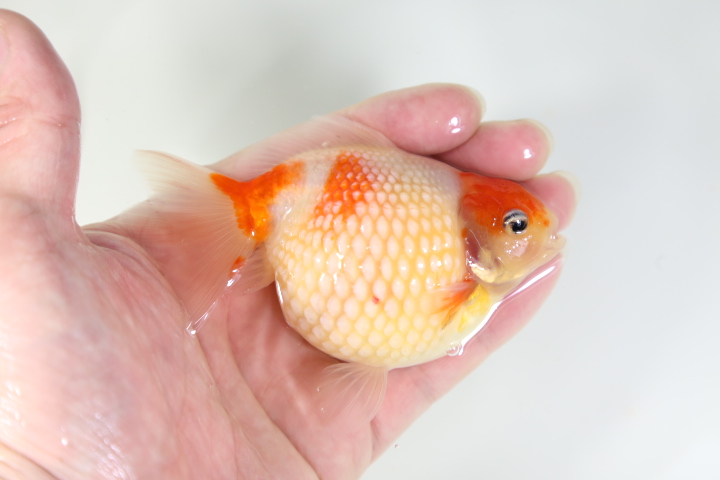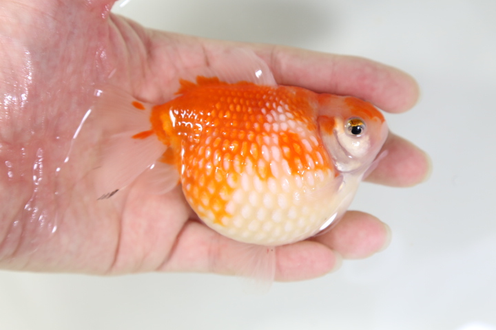 ※京桜・・・京錦の紅白透明鱗タイプ、京錦はモザイク透明鱗いわゆるキャリコ柄でランチュウ体型でありながら尾鰭が長い品種。