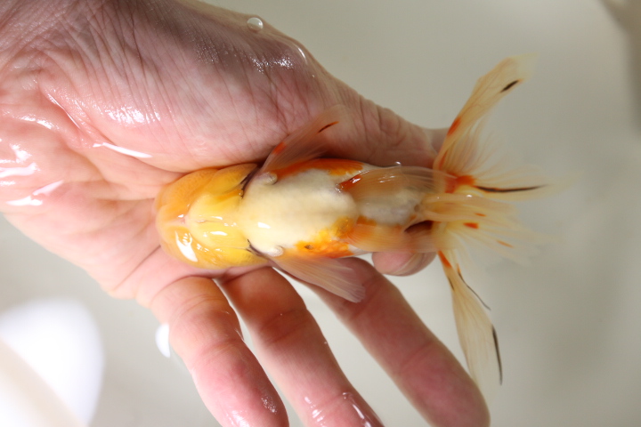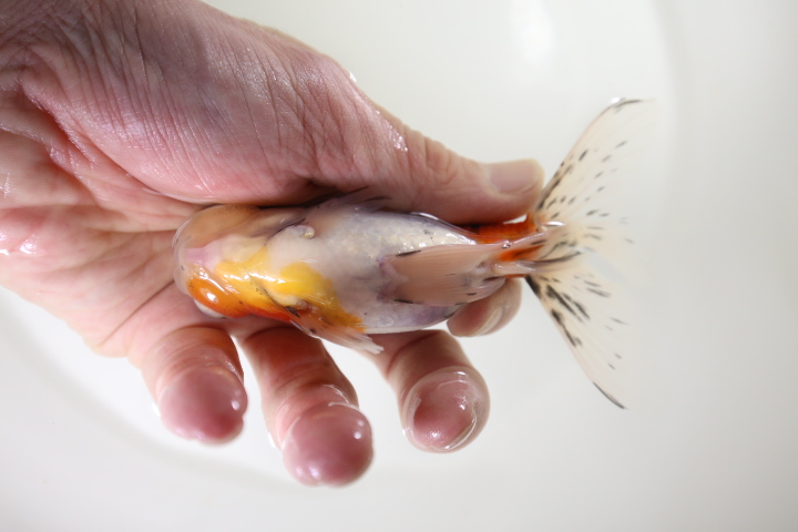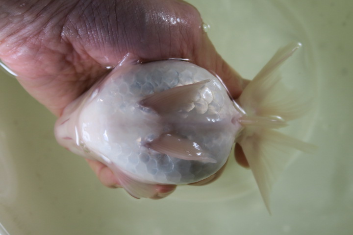 金魚ちゃんはもともと透明な粘膜に包まれているのですが、その粘膜が白く凝固したり、薄くなって真皮が露出して充血したり、ひどいと病気になってしまったりする。