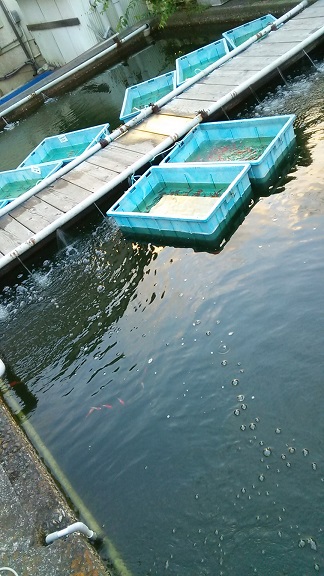 コンクリートの池の枠にちょこっと腰を掛けての選別は何だか風情があります